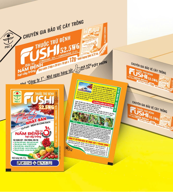 - Thuốc trừ bệnh FUSHI 52.5WG là sự kết hợp hoàn hảo giữa Famoxadone - hoạt chất bảo vệ mạnh, bám dính tốt, ức chế sự phát triển của nấm bệnh và Cymoxanil - hoạt chất đặc trị nấm bệnh với hiệu lực nhanh, tiêu diệt sạch bào tử và sợi nấm.